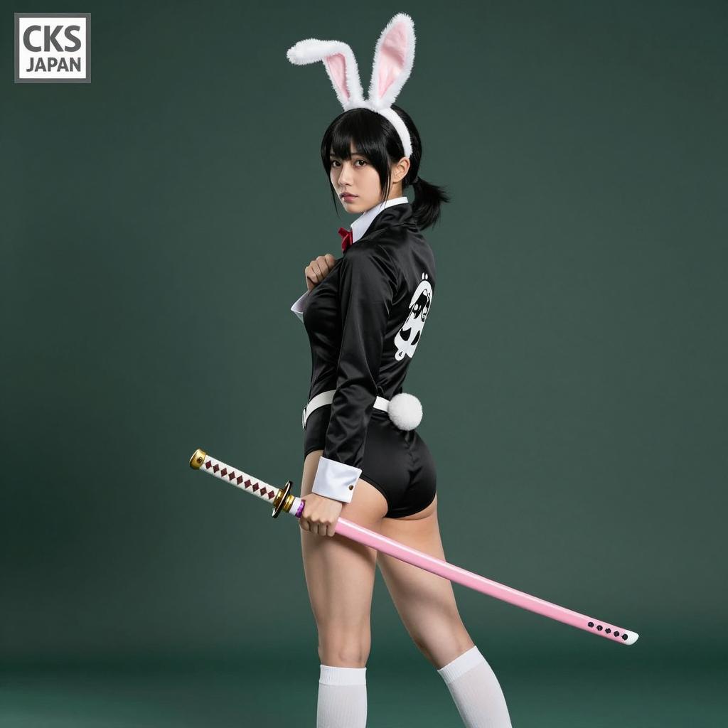 Asian woman with black hair in ponytail, wearing white bunny ears, black jacket with white design, black skirt, white knee-high socks, holding pink and white katana in right hand. Standing in profile, looking back over shoulder. Dark green ured background. Holding jacket with left hand. Light shines from top left. "CKS JAPAN" in top left corner.