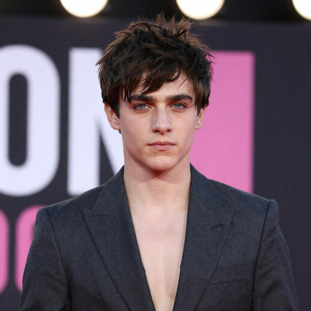 Photograph of a young man with tousled dark brown hair and blue eyes, wearing a dark gray suit jacket. He stands in front of a blurred black banner with white and pink . The background includes bright, out-of-focus lights. His expression is serious and slightly intense.