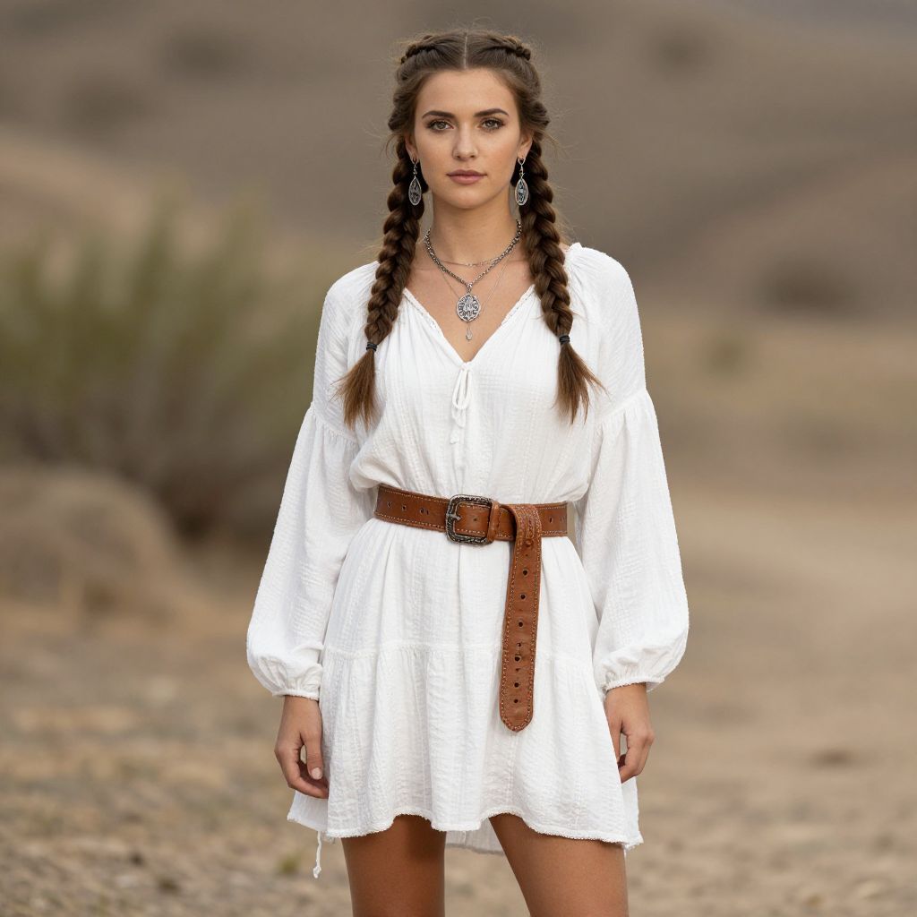 Boho Outfit Female Costume, woman with braids and a white dress and a brown belt