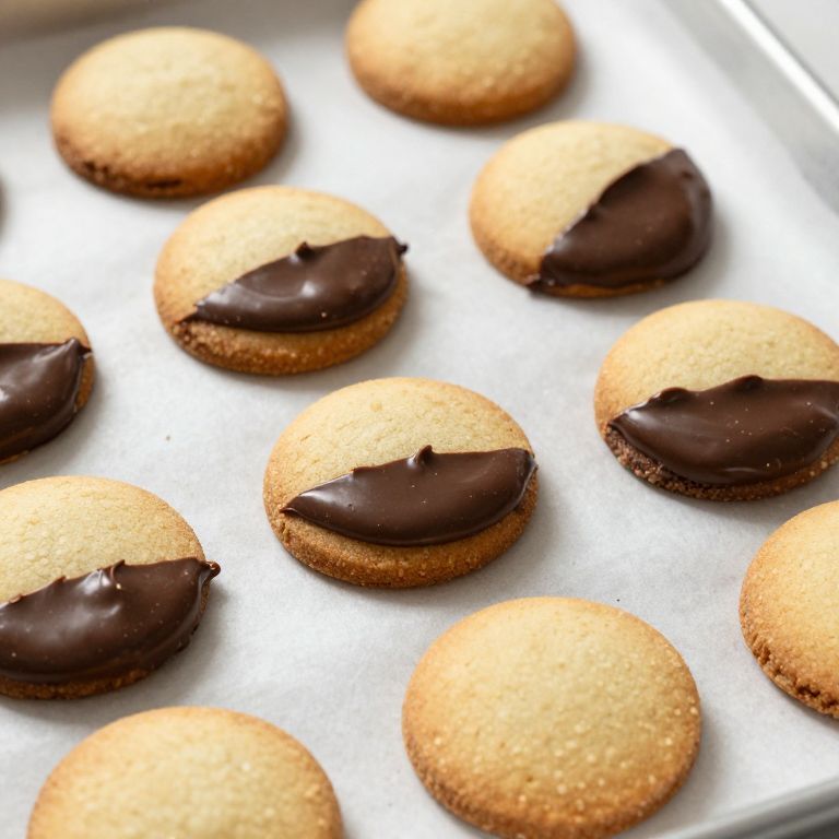 Golden shortbread cookies, each half-dipped in rich chocolate fudge, are neatly arranged on a baking sheet lined with parchment paper, showcasing their smooth, glossy finish and delicate texture.