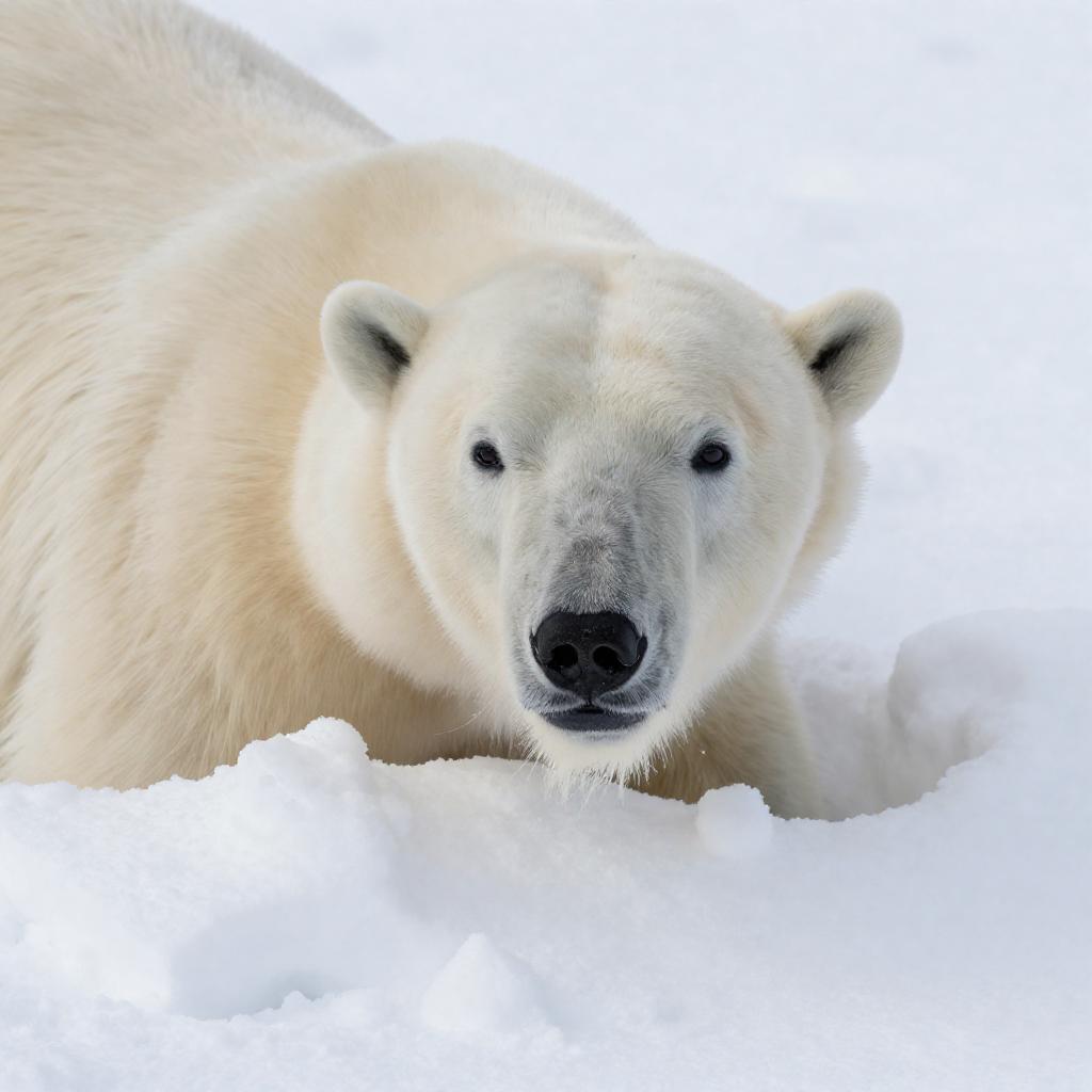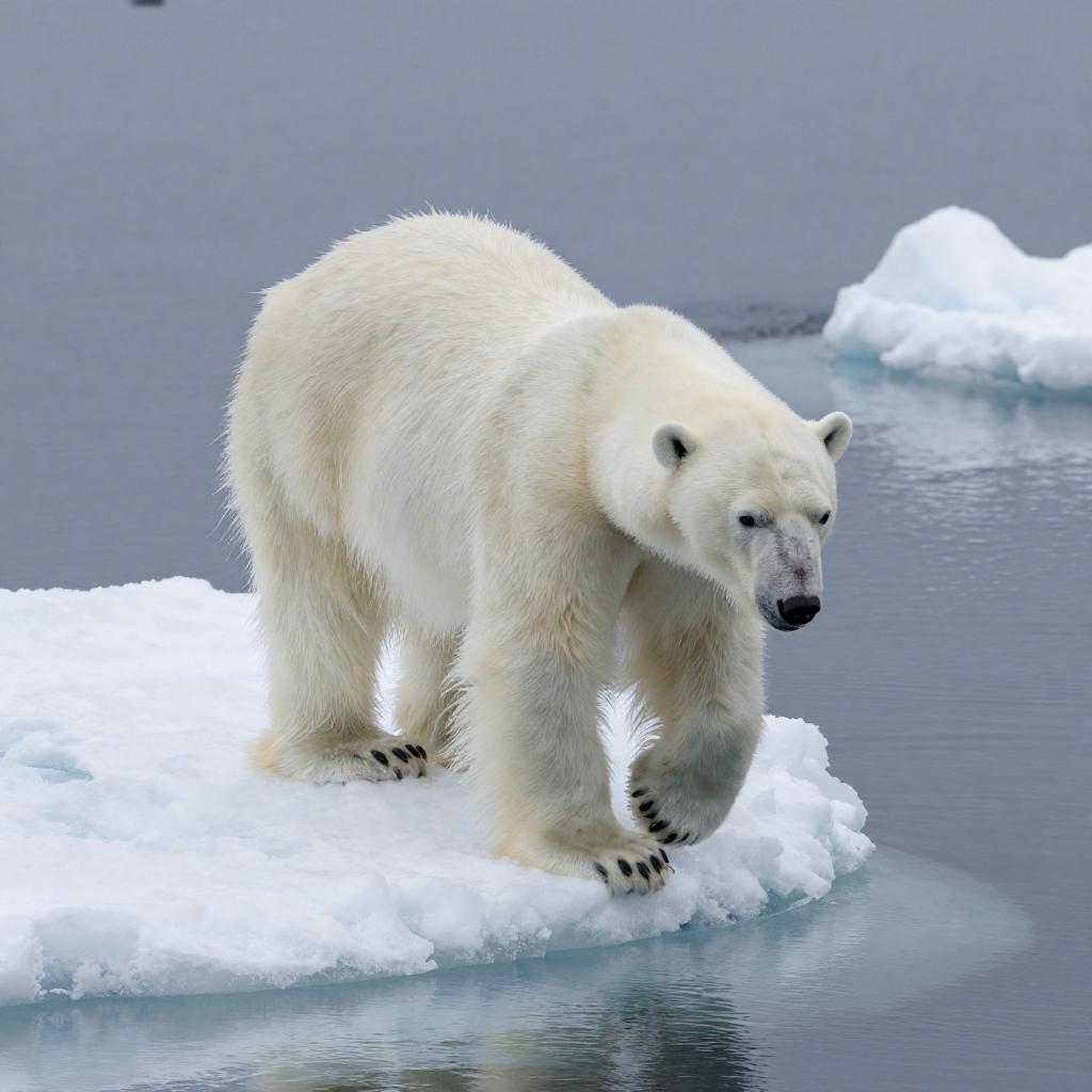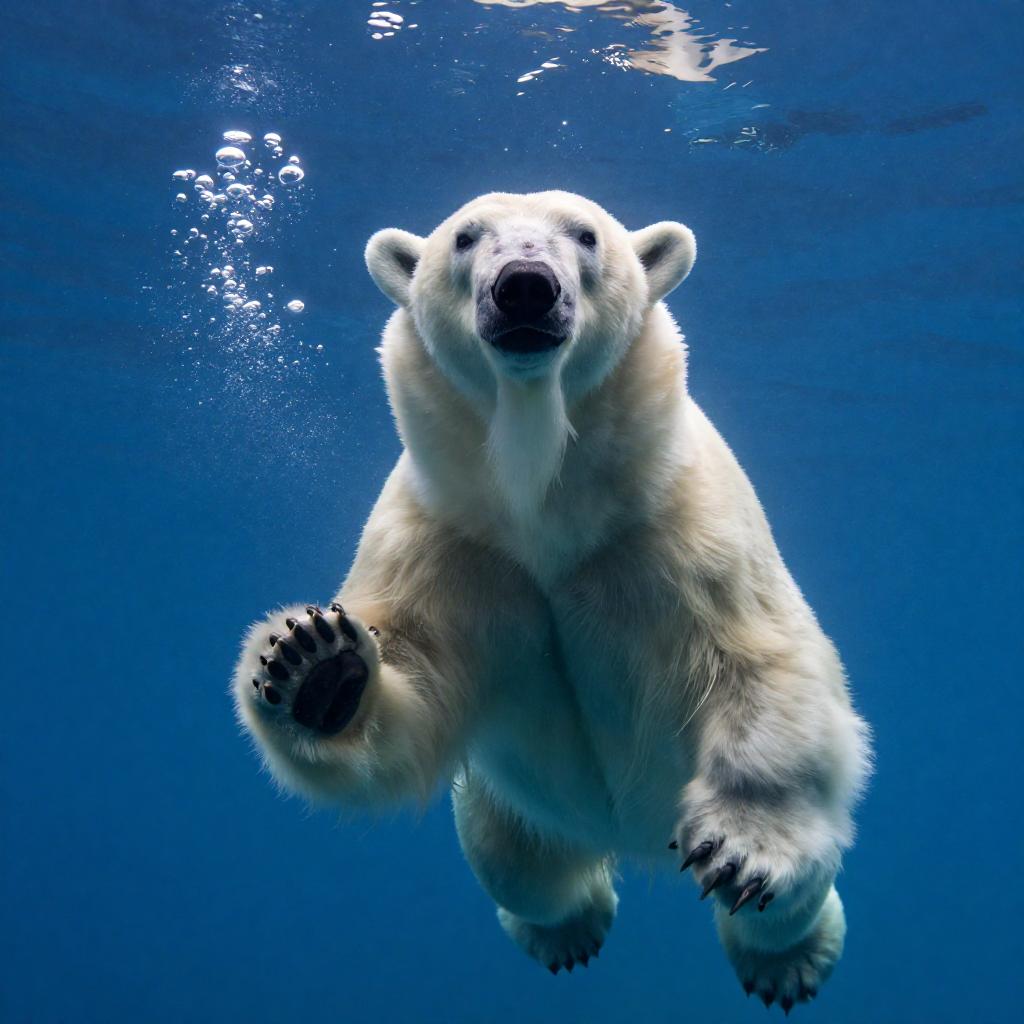 Photograph of an underwater polar bear swimming with its large, black-padded paws facing the camera. The bear's white fur contrasts against the deep blue, sunlit ocean background. Bubbles surround the bear, adding a sense of motion. The bear's head is slightly tilted upward, and its body is partially illuminated by sunlight from above.