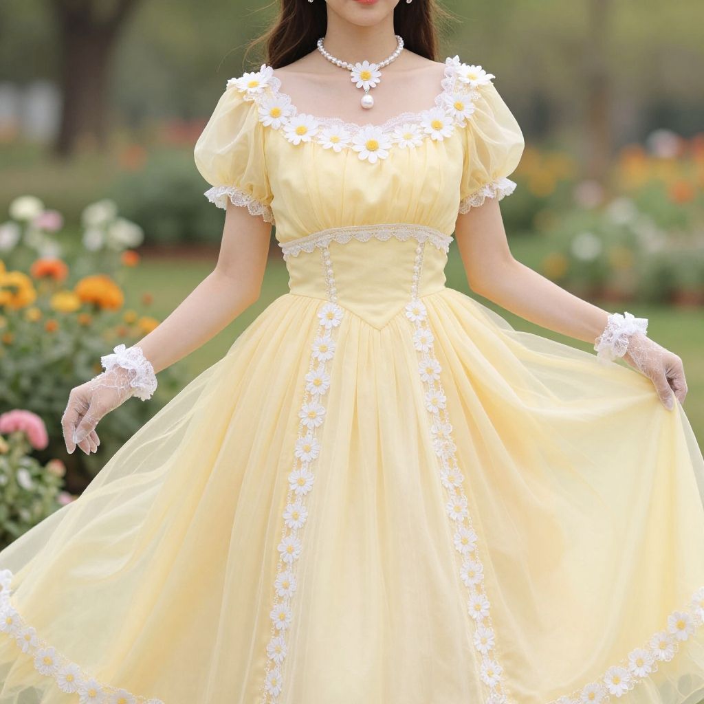 Photograph of an Asian woman with long dark hair, wearing a bright yellow, full-skirted, short-sleeved dress adorned with white floral lace trim on the bodice, sleeves, and hem. She also wears white lace gloves and a pearl necklace with a white daisy flower pendant. The background is a blurred garden with colorful flowers, including orange and pink blooms. The sunlight illuminates her dress, making it stand out. Her dress is slightly lifted, revealing the delicate layers of the skirt. The overall scene conveys a fairytale or princess-like elegance.