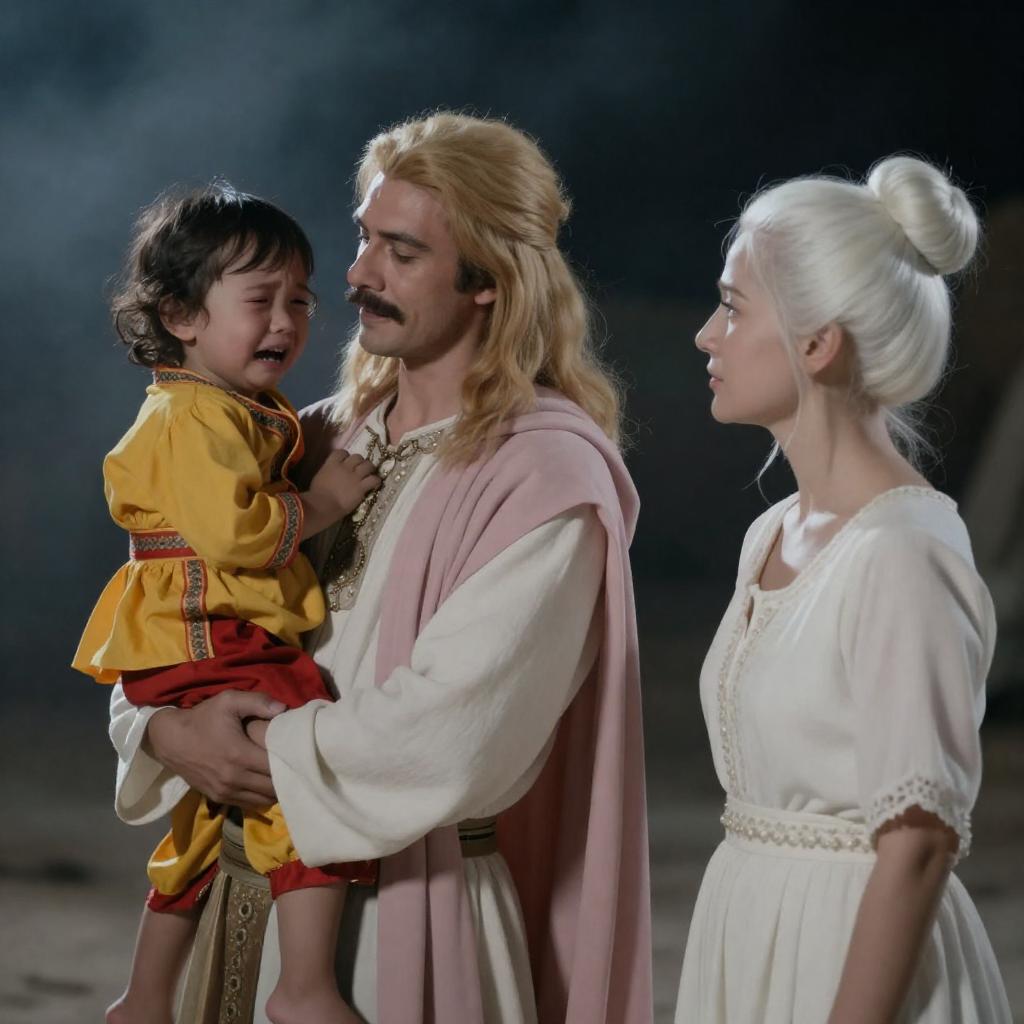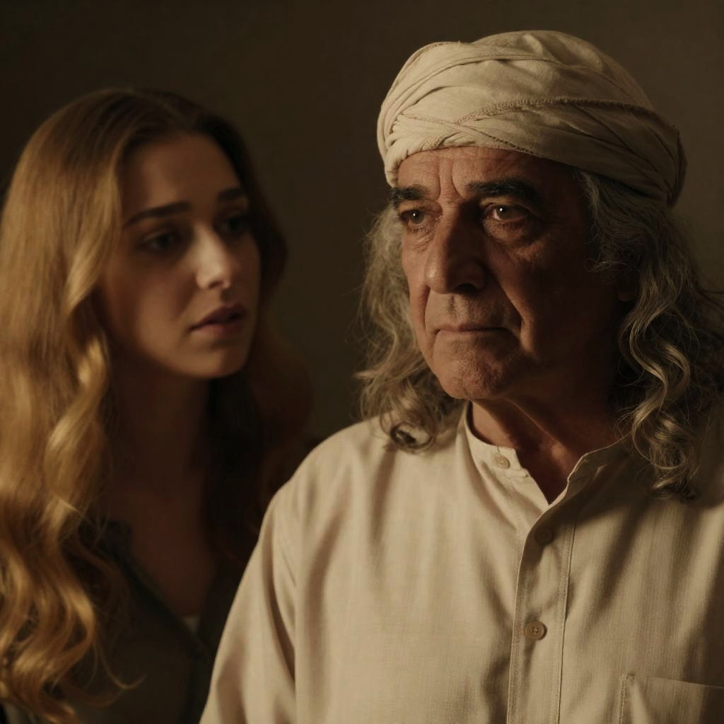 Photograph of an older man and a younger woman. Man with long, curly gray hair, wearing a beige headscarf and tunic, looks to the side with a serious expression. Woman with long, wavy blonde hair, looks at him with a concerned expression. Warm lighting, dark background. Both close together, man slightly in front.
