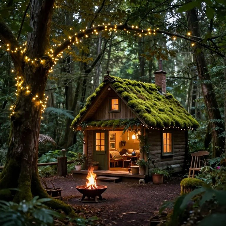 Cozylittlehouse tucked into a dense enchanted forest, fairy lights twinkling among the tree branches, moss-covered roof blending with nature, a cozy fire pit outside, magical and mysterious ambiance with soft glows and shadows.