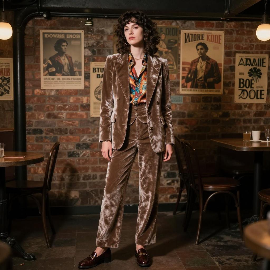 70s outfits: soft-spoken bohemian poet with a melancholic, introspective aura dressed in a three-piece velvet suit with wide lapels, a patterned silk shirt, and polished loafers, standing in a smoky underground poetry loft with exposed brick walls and vintage posters.