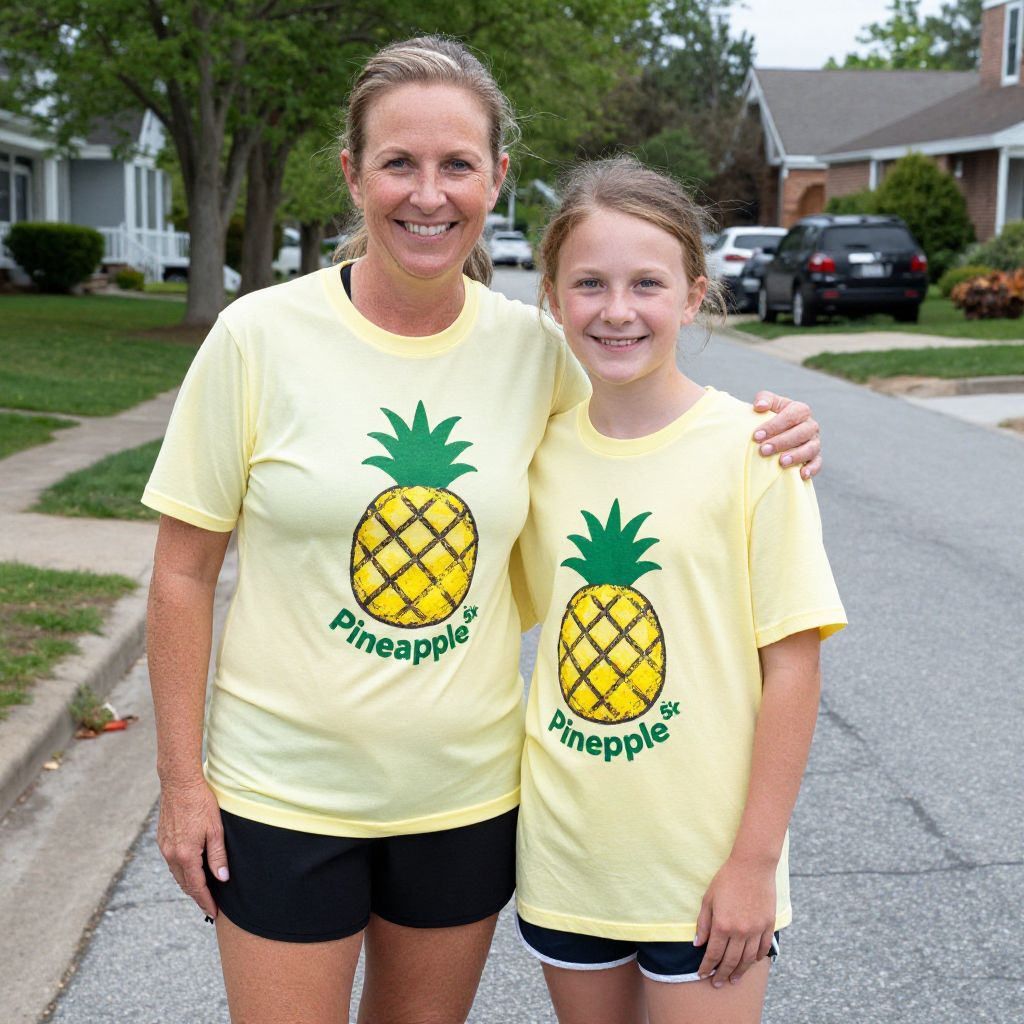 Two participants, a smiling adult woman and a young girl, pose together at the Pineapple 5K Run in Greenwich on May 18, wearing matching shirts featuring a pineapple logo, with a suburban street and parked cars visible in the background.