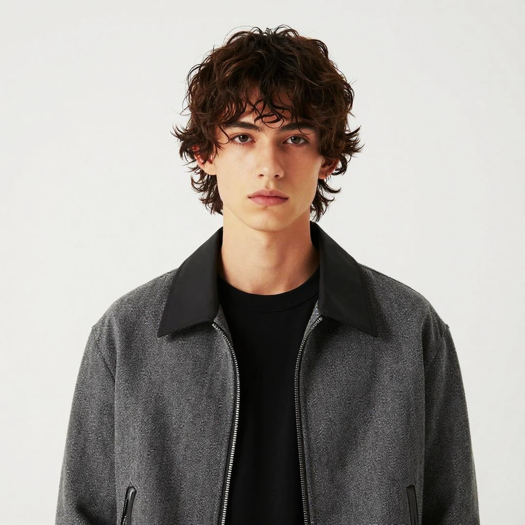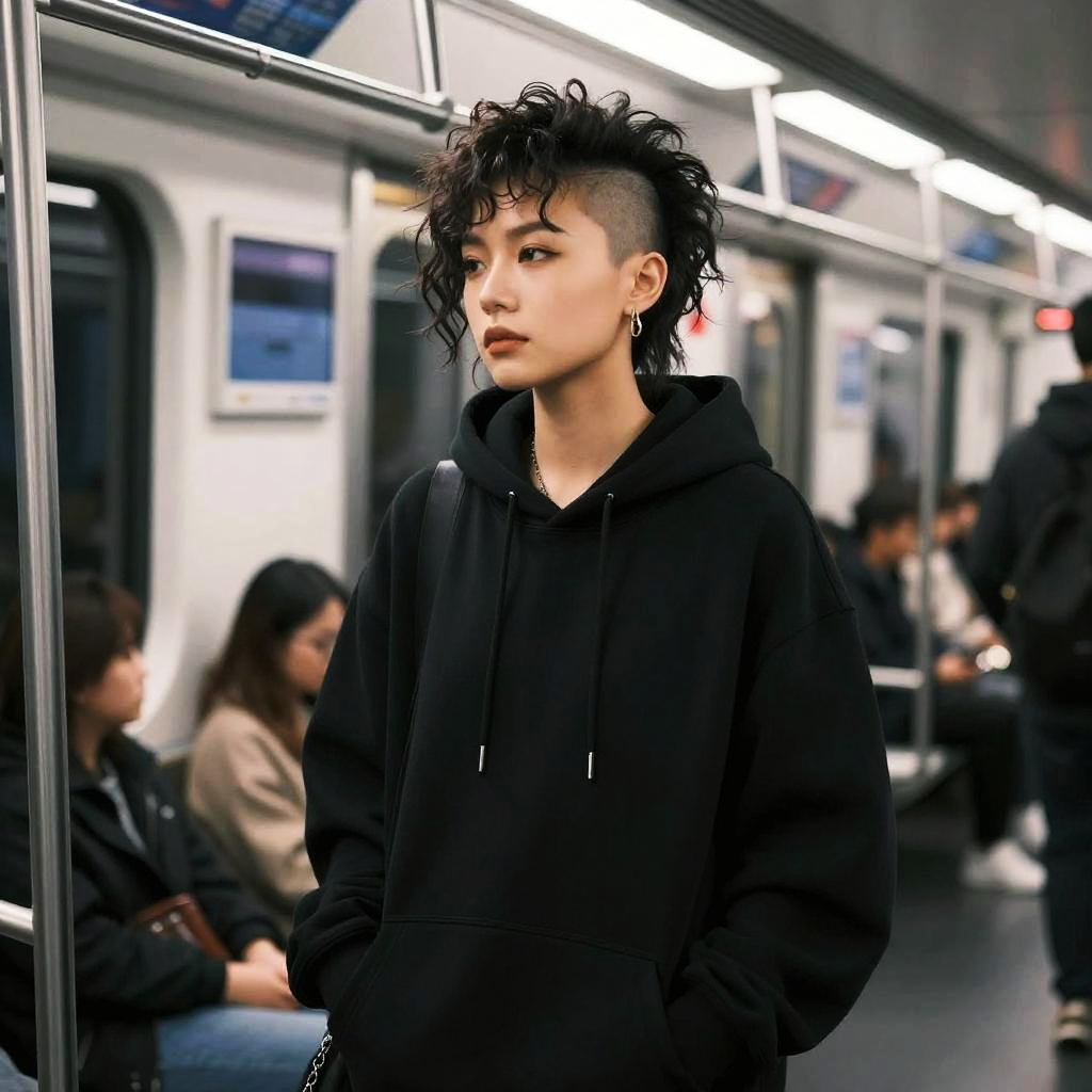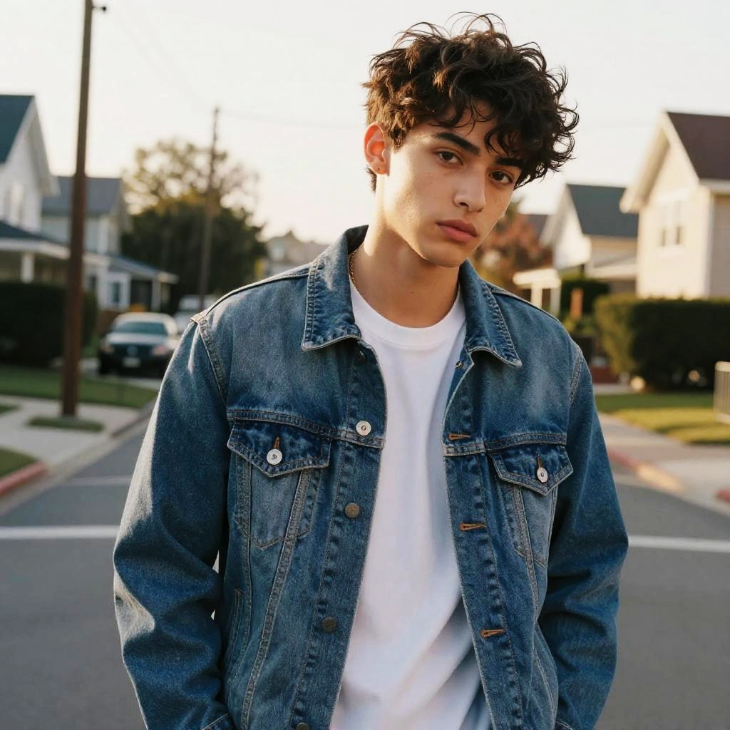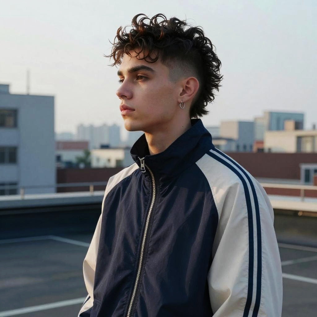 Wavy Mohawk hairstyle on young man, wearing denim jacket, in beach, captured in fashion editorial style with soft pastel sunset.