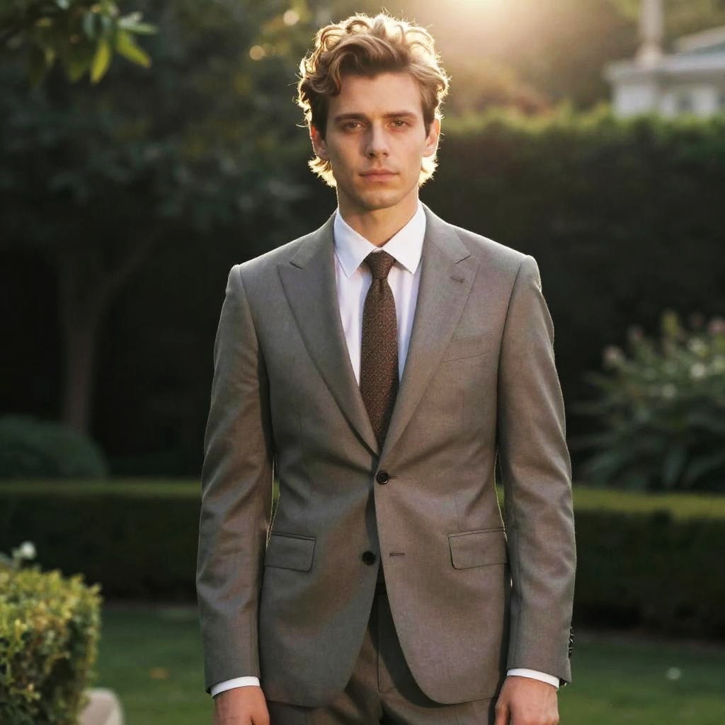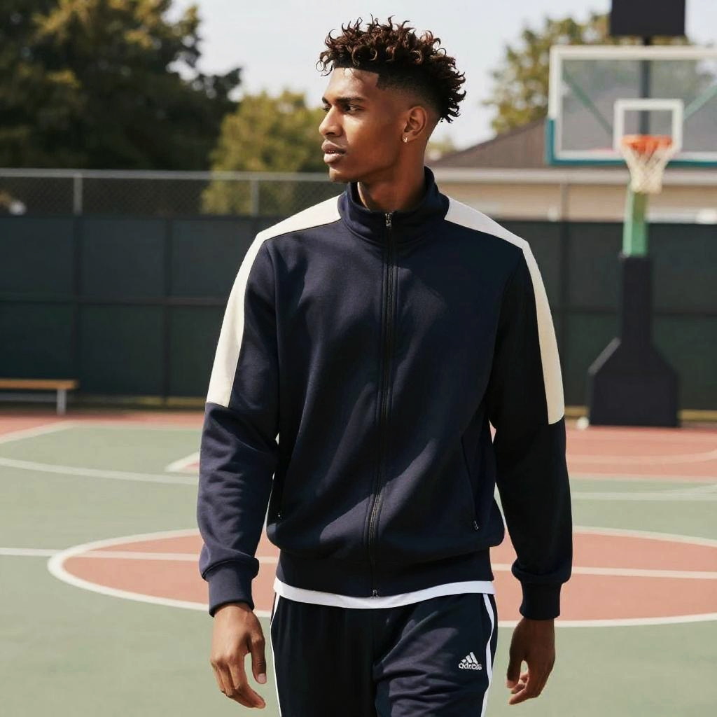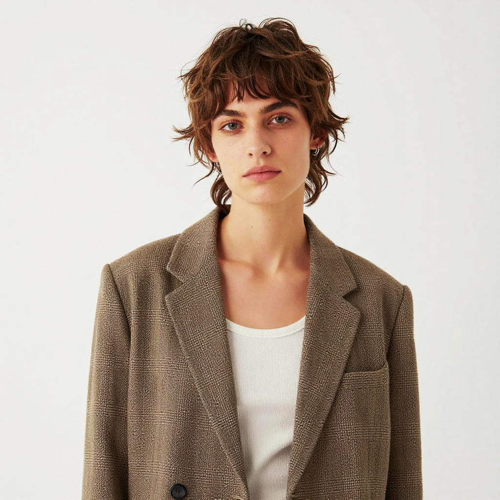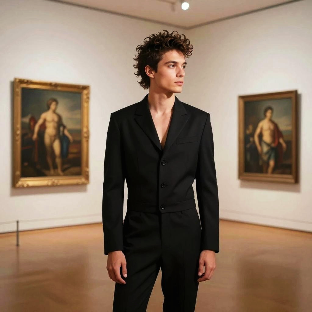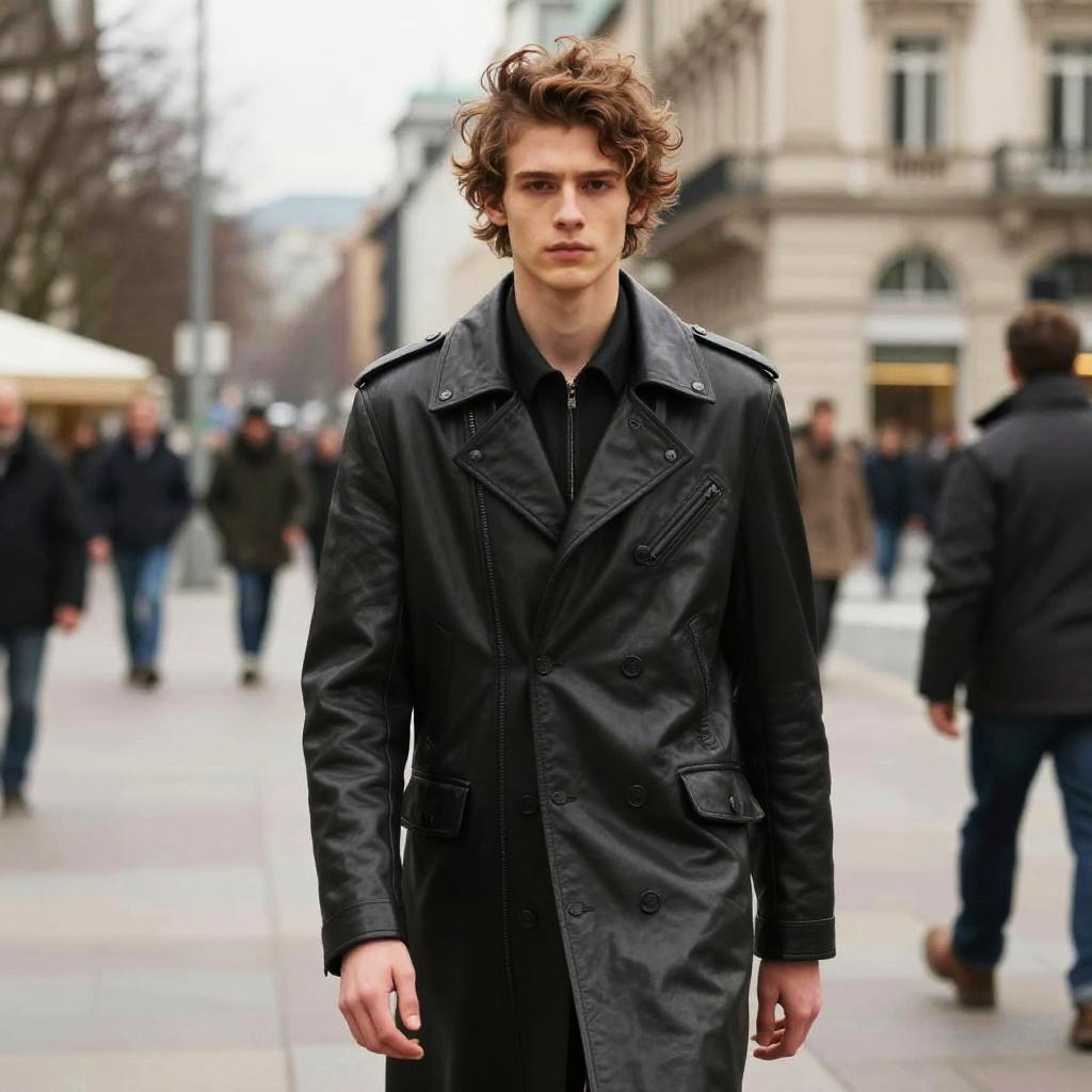 Wavy Mohawk hairstyle on young man, wearing denim jacket, in beach, captured in fashion editorial style with soft pastel sunset.