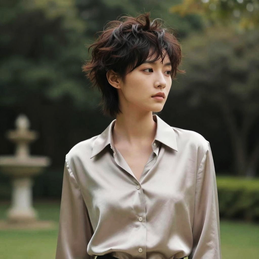 Photograph of an Asian young man with messy black hair, wearing a blue denim jacket over a black shirt, standing on a beach at sunset. His profile is visible, looking to the left. The background features a pastel-colored sky with pink and purple hues, and the ocean waves are gently crashing onto the sandy shore. The denim jacket has silver buttons and chest pockets. His expression is thoughtful, and the soft evening light highlights his face. The overall mood is serene and contemplative.