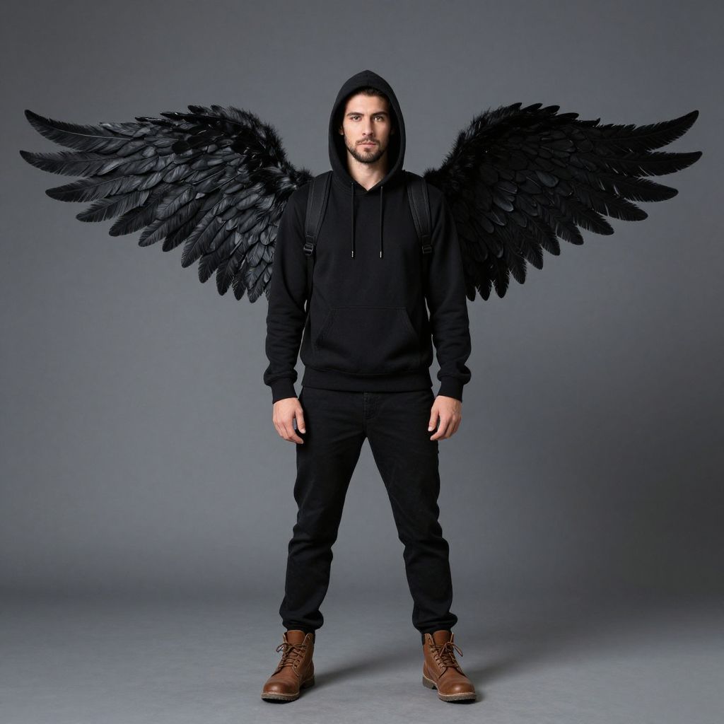 Black wings costume man, 1boy, wings, male focus, solo, black wings, brown footwear, full body, hood, standing, backpack, pants, feathered wings, hoodie, facial hair, black pants, looking at viewer