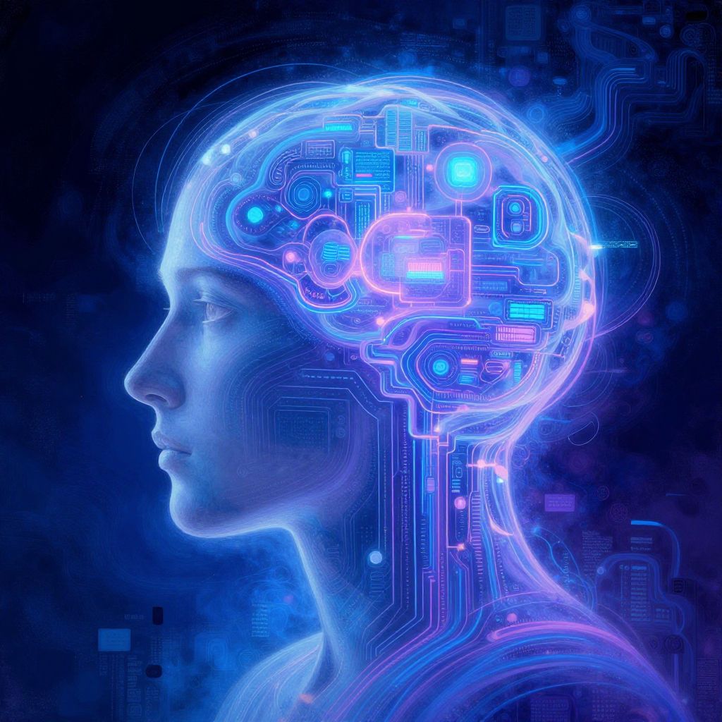 Cybernetic side profile of a woman with glowing blue and purple circuitry in her head, set against a dark, digital background. Digital art