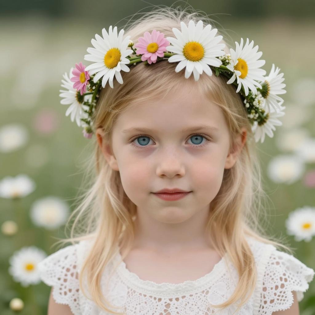 Close-up photograph of a young blonde girl with blue eyes, wearing a floral head wreath of daisies and small pink flowers. She has fair skin, a soft expression, and is surrounded by a field of similar flowers. She wears a white lace top. The background is a blurred field of daisies. The focus is on her face.