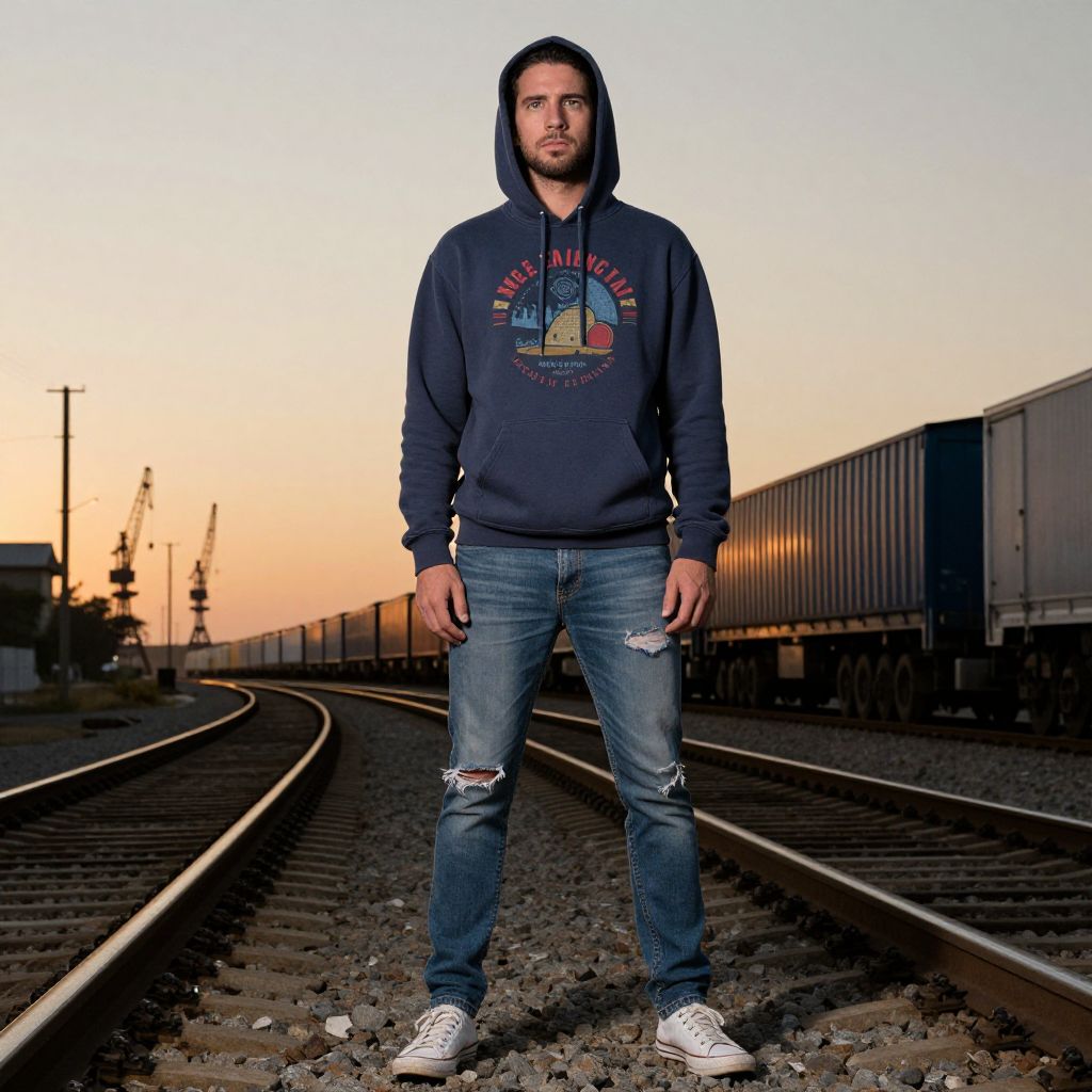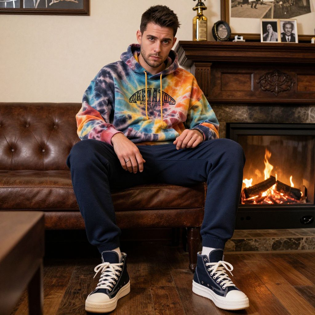 "a man, oversized graphic hoodie in tie-dye colors, tapered joggers in navy, chunky high-top skate shoes, laid-back urban style, cozy lobby, vintage decor, warm fireplace glow, vintage photo, relaxed expression. Man has masculine face and piercing eyes"