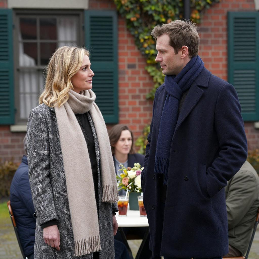 Photograph of a gravesite. Man in black clothes holding blonde woman in black beret and brown top. Woman in black boots and gray skirt with white blouse. Boy in black suit standing left. Woman in red jacket and black boots standing right. Floral arrangement on ground. Two gravestones in foreground. Green hedge in background. Outdoor patio with chairs in background. Man and woman kissing. Boy looking down. Woman in red jacket looking at camera. Intense expressions.