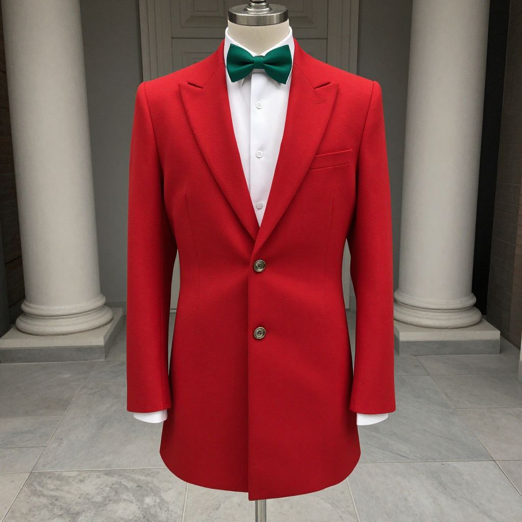 Photograph of a red tuxedo jacket with green bow tie, white dress shirt, displayed on a mannequin against a classical column background.