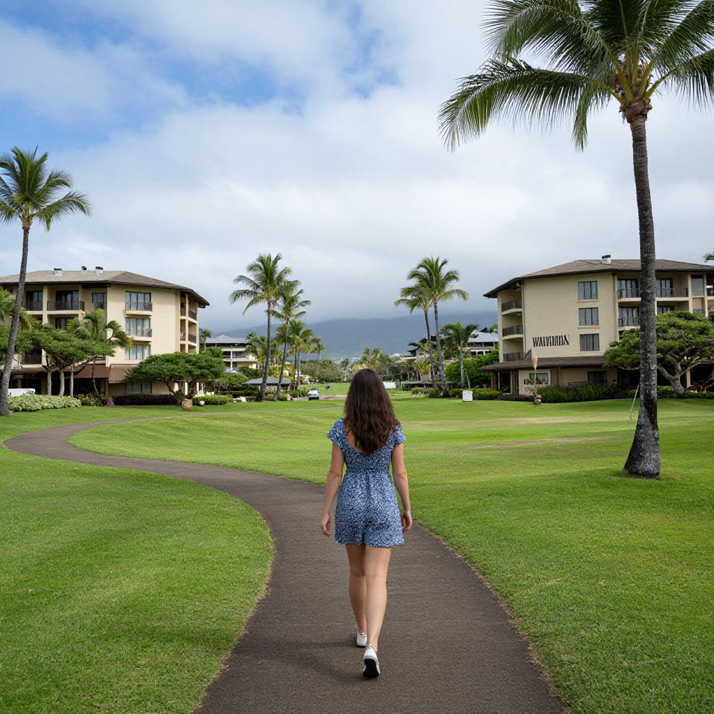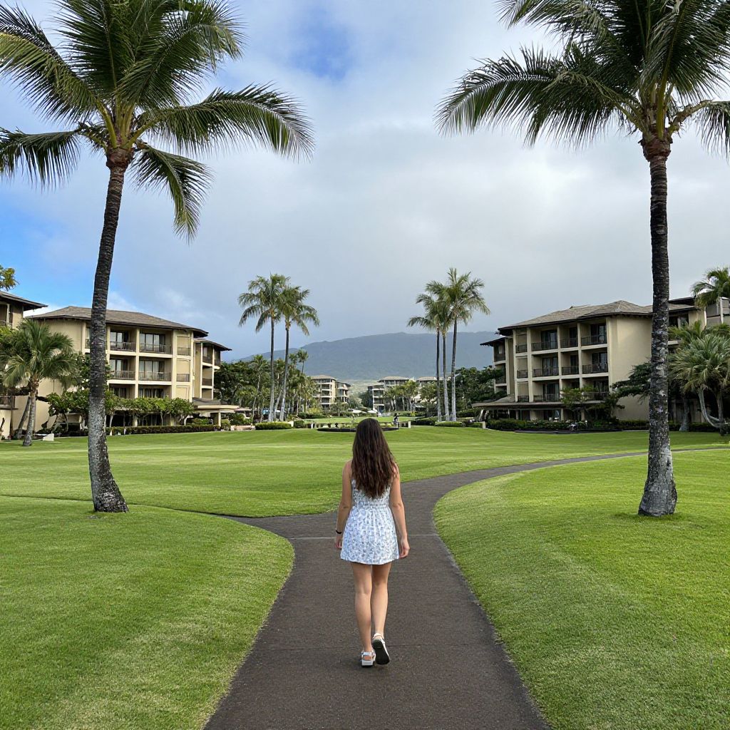 Woman walking along a paved path through lush green grass, framed by palm trees and resort buildings under a partly cloudy sky at Hilton Waikoloa Village, Big Island, Hawaii.