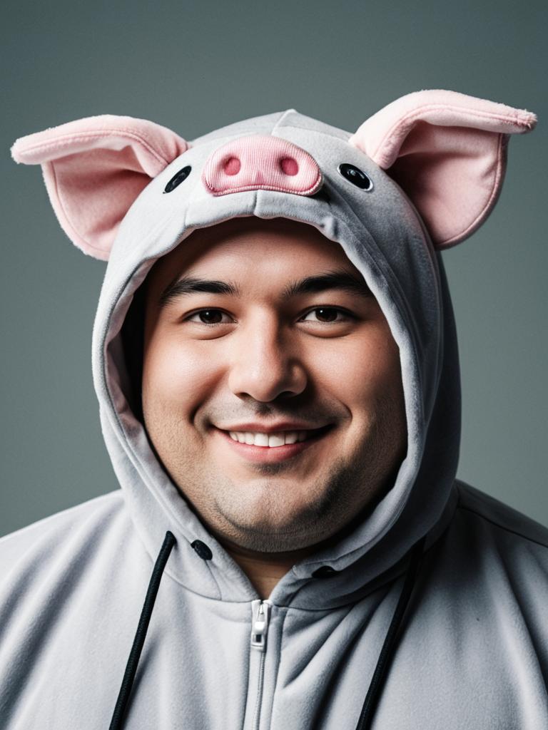 Plus size pig costume, solo, realistic, 1boy, male focus, animal costume, looking at viewer, simple background, kigurumi, grey background, upper body, cosplay, smile
