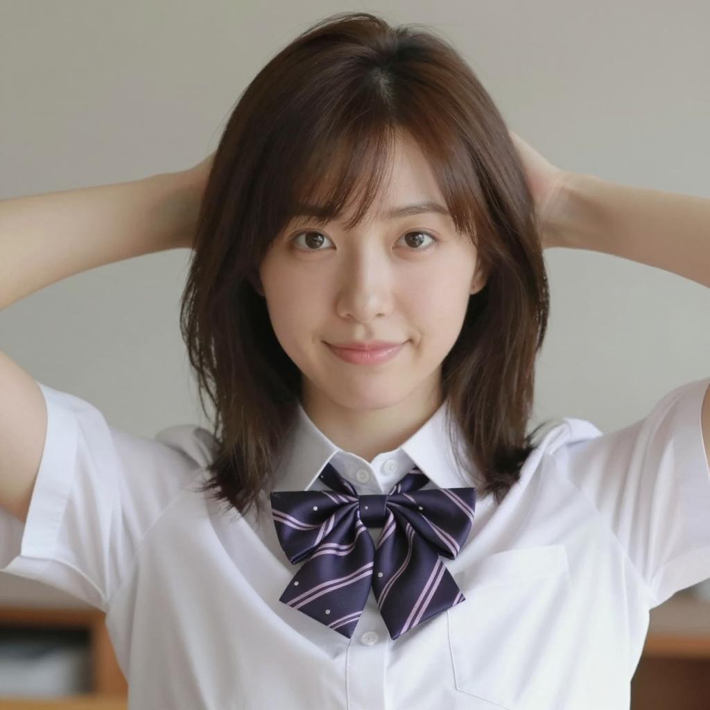 Japanese woman with fair skin and brown hair in a floral patterned dress, elbows on table, hands resting on chin. Foreground has a plate with a pastry, glass of water, and small vase with flowers. Background is blurred. She has a neutral expression. Soft lighting. Magazine-style photograph.