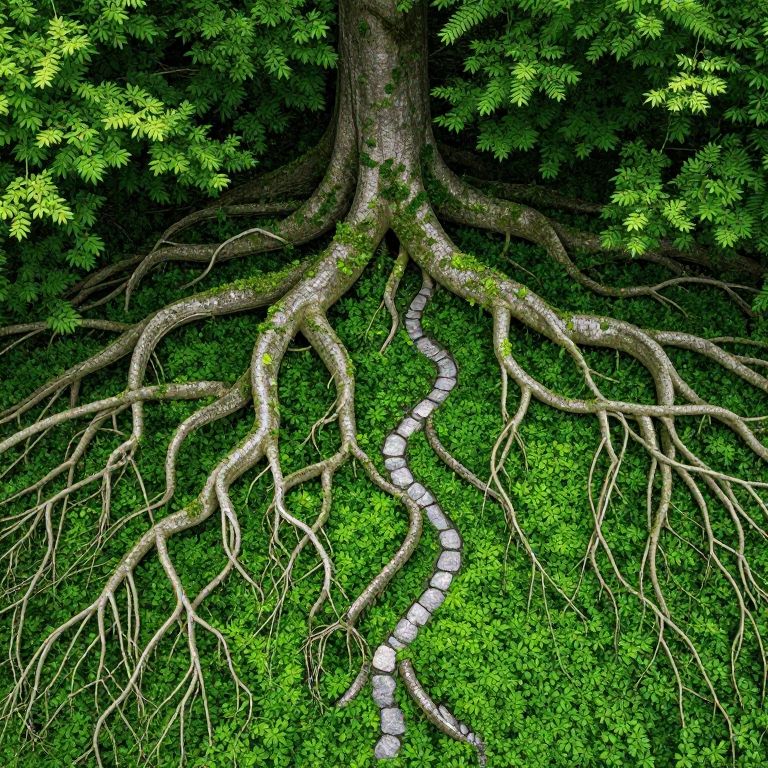Trees grow from the ground-upward and downward-downward, forming tributaries of roots that flow into leaves, creating rivers made of leaves and streams made of stone.