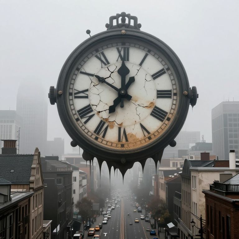 A colossal, decaying clock looms over a fog-shrouded city, its face cracked and dripping like molten sand, while the streets below seem to vanish into an abyss, defying gravity and reason.