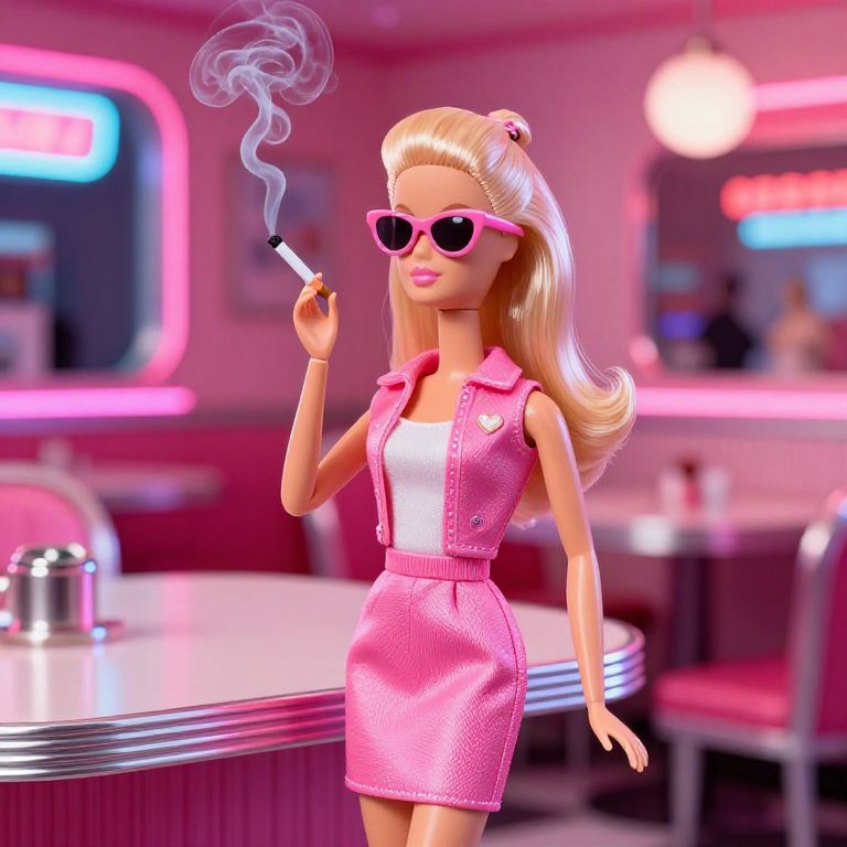 Smoking Barbie doll in a retro 1950s diner setting, dressed in classic pink outfit with stylish sunglasses, holding a cigarette with smoke curling upwards, neon lights reflecting on the counters, vibrant and nostalgic atmosphere, photorealistic style.