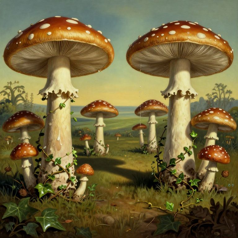 Craft an image reminiscent of Dalí's surrealist visions, depicting a garden viewed from an insect-like perspective. In this dreamlike landscape, enormous mushrooms with complex patterns command the scenery. Delicate ivy tendrils entwine these giant fungi, their leaves gleaming like flowing mercury under soft sunlight that extends long, surreal shadows across the scene. This image evokes both fascination and unease, challenging our perception of reality as it invites us to uncover the enigmatic allure concealed within our subconscious realms.