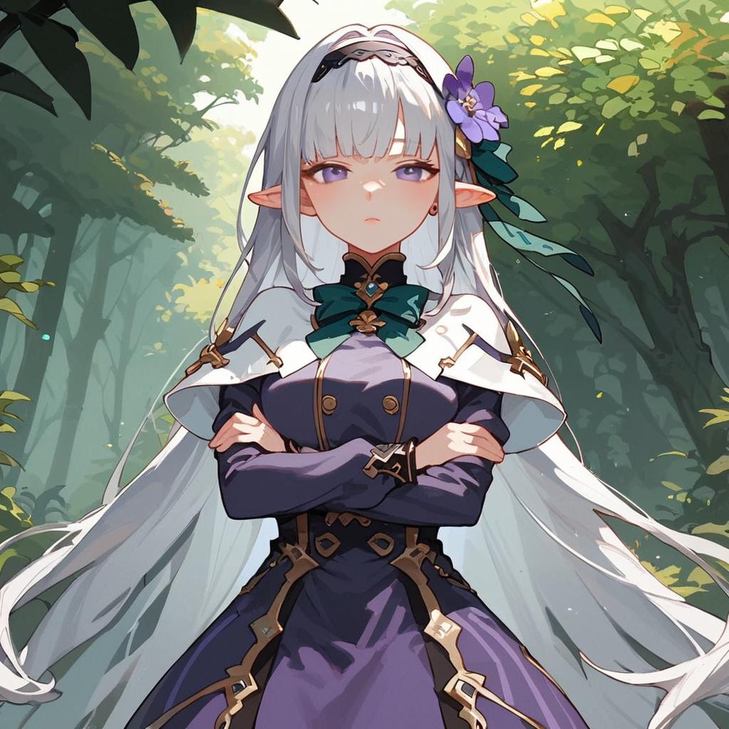 Score_9, score_8_up, 1girl, long hair, grey hair, hair flower, bangs, pointy ears, hairband, solo, blunt bangs, white capelet, long sleeves, looking at viewer, purple dress, very long hair, standing, green bow, cowboy shot, purple eyes, crossed arms, pout, outdoors, forest, anime screencap, anime coloring, source_anime