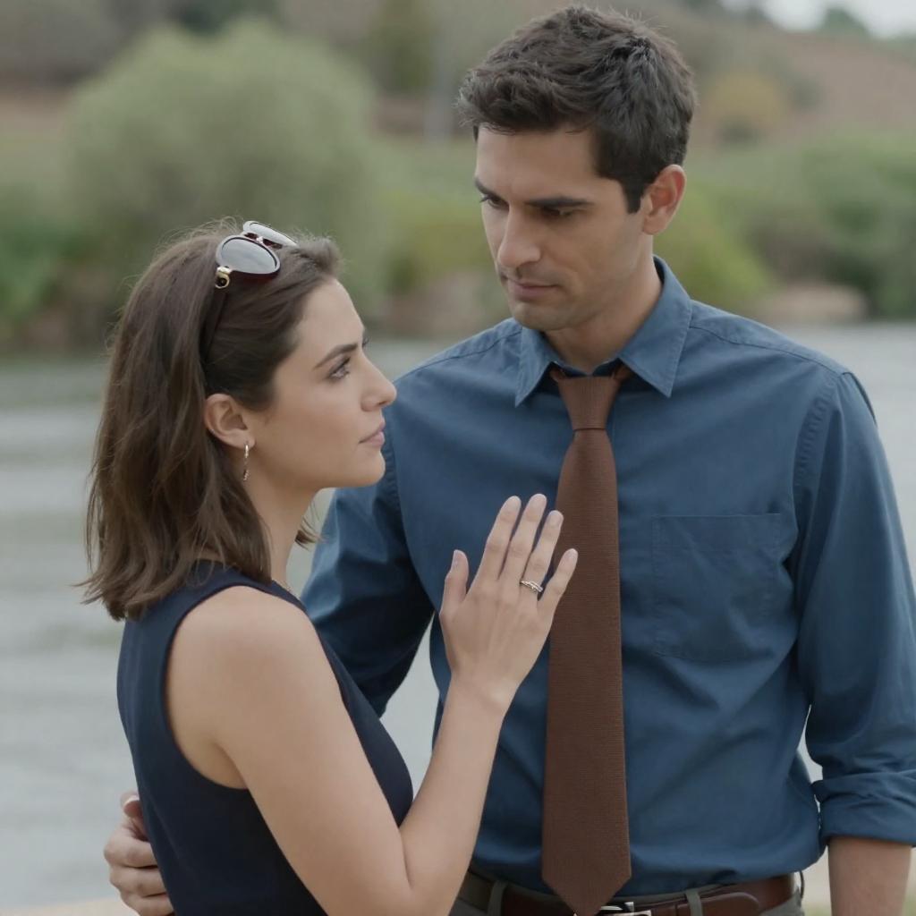 Photograph of a man and woman standing close. Man with short dark hair, serious expression, wearing blue shirt and brown tie. Woman with shoulder-length brown hair, sunglasses on head, topless, holding his hand with a ring, looking at him. Background has blurred greenery and a river. Man's left arm around her back. Both focused on each other.