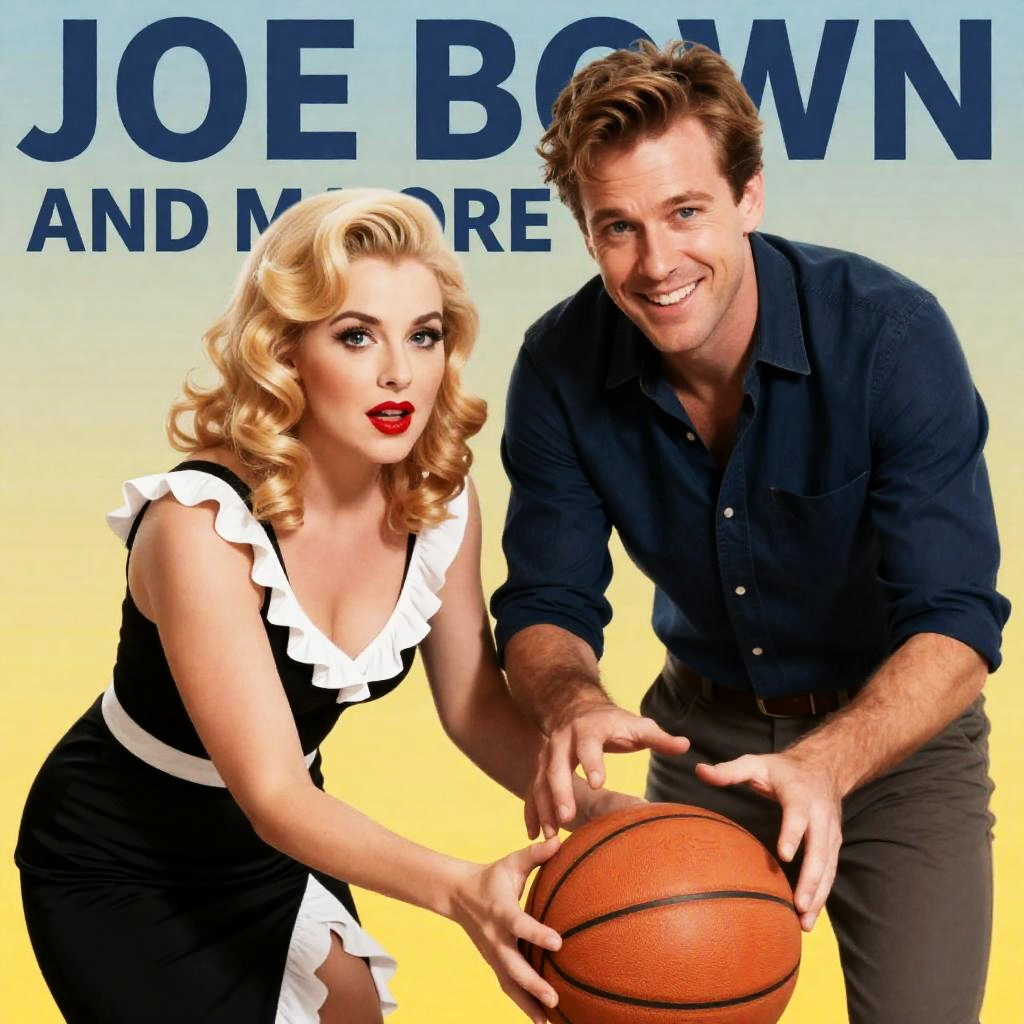 Poster of Joe Brown and Marjorie Earl, a blonde woman with curled hair and red lipstick, leaning forward, hands reaching towards a basketball. Joe Brown, wearing a dark blue shirt, smiles. Marjorie Earl wears a black dress with white ruffles. Both have intense expressions. Background is yellow with a blue gradient.