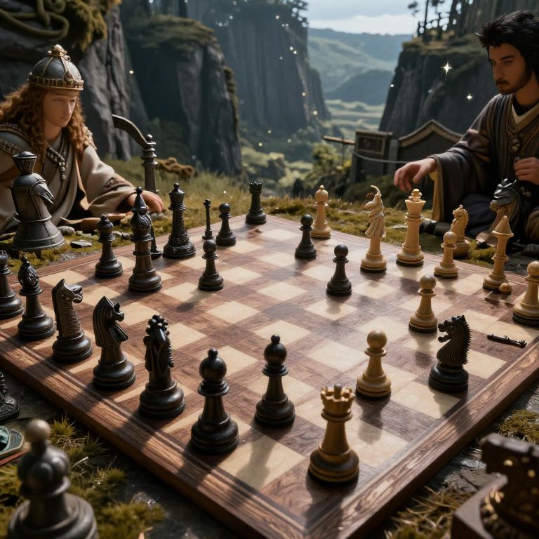 A colossal chessboard spans a valley where knights inspect pieces from ancient myth, and kings move like falling stars.
