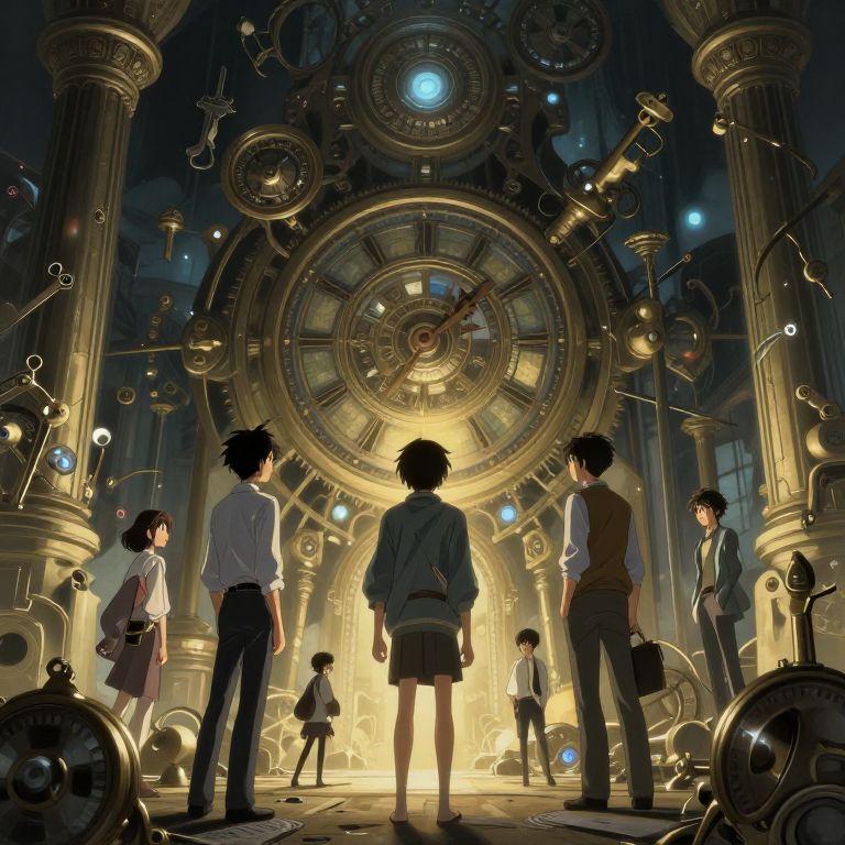 Anime-style digital illustration of six children standing in awe before a massive, glowing, steampunk clock in a dimly lit, mechanical room.