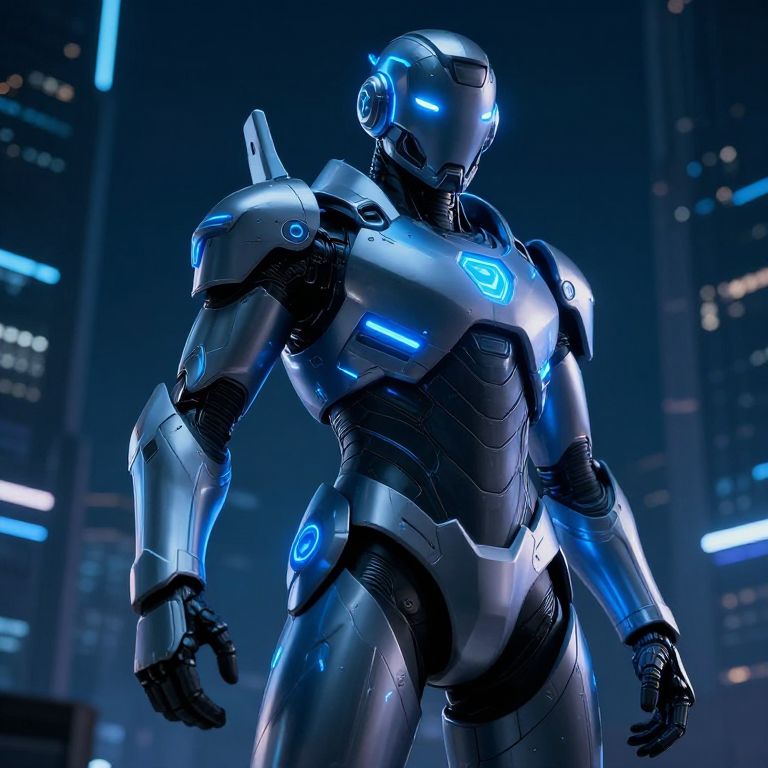 Photorealistic CGI image of a futuristic, humanoid robot standing in a dark, urban night scene. The robot is silver with blue neon accents, including glowing lights on the chest, shoulders, and arms. It has a sleek, muscular build with articulated joints and a helmet-like head with a blue light on the top. The background features blurred, illuminated skyscrapers with blue and white lights, adding depth and a sense of a high-tech cityscape. The robot's design is sleek and futuristic, resembling a high-end android or mech. The overall color palette is dominated by blues and silvers.