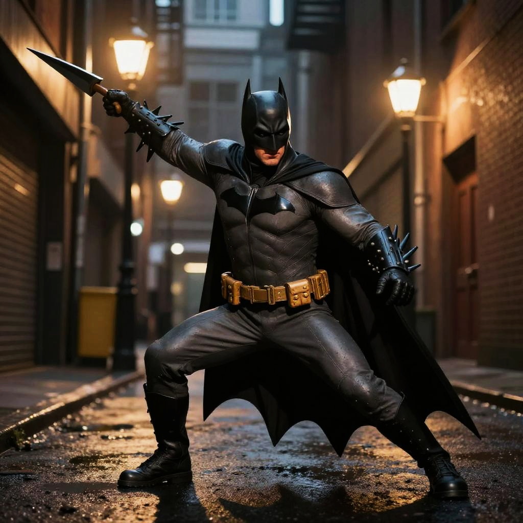 Batman casual outfit, sleek black jacket and jeans with minimalist bat logo, relaxed pose in a coffee shop, moody shadows, high detail, realistic style