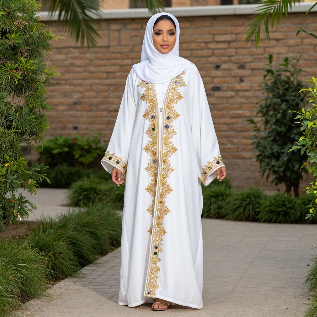 Woman wearing an elegant white African Boutique Exclusive Muslim Abaya Jalabiya with intricate gold embroidery and stone embellishments, gracefully posing outdoors on a paved pathway surrounded by lush greenery and a brick wall backdrop.