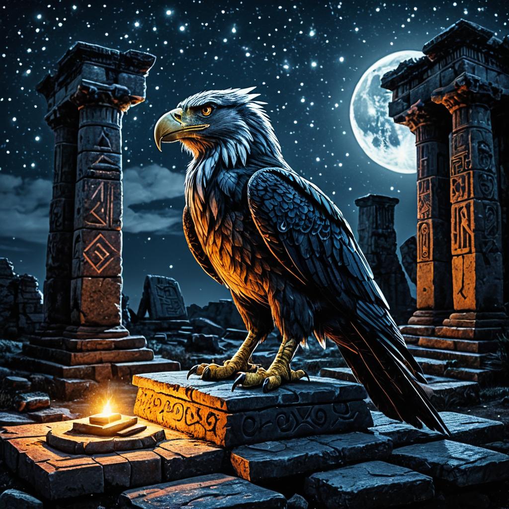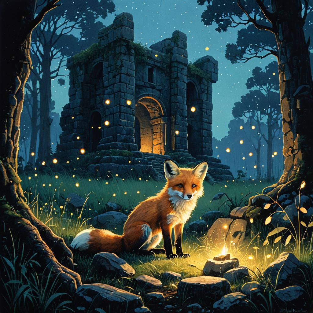 A fox cub sitting in a mystical woodland clearing at twilight, surrounded by glowing fireflies. In the background are ancient stone ruins covered in moss, illuminated softly under a starry sky. The scene evokes magical realism with fluid textures and soft lighting, inspired by Studio Ghibli and Ralph McQuarrie concept art styles.