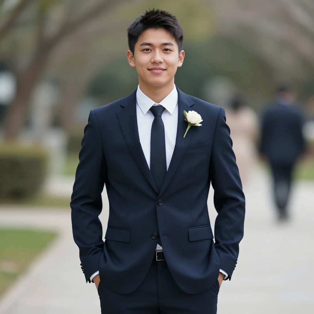 Photograph of an Asian man in a black suit with a white rose boutonnière, black tie, and hands in pockets, standing on a