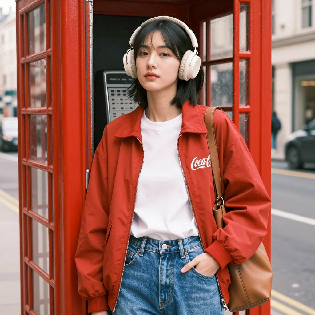Asian woman with short black hair, wearing a red Coca-Cola jacket, white shirt, blue jeans, and beige headphones. She stands in a red phone booth, hand in pocket, brown bag on shoulder. Background shows urban street with buildings. Urban, casual style. She has a relaxed expression. Color photograph.