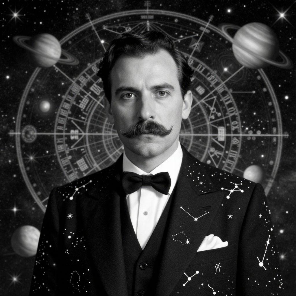 A monochrome, highly detailed digital portrait of a man with a mustache dressed in a classic suit adorned with constellation patterns. Behind him is an intricate celestial backdrop featuring an astrological chart and various planetary bodies, blending vintage realism with cosmic and scientific themes.
