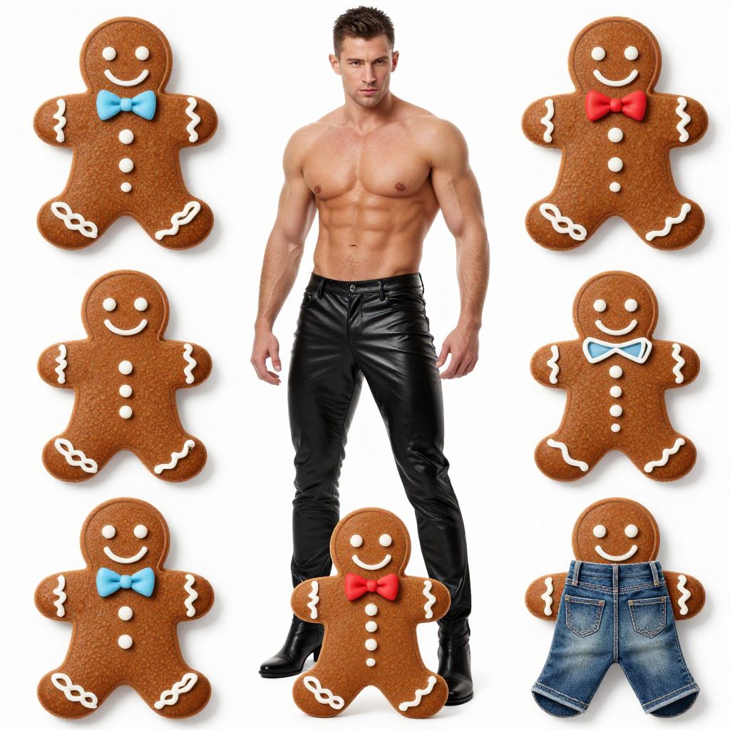 Ultra-realistic photo of a shirtless muscular brunette man with short hair wearing shiny tight black leather pants and black boots, surrounded by multiple gingerbread cookies decorated with white icing and colorful bow ties. One gingerbread cookie is dressed in denim shorts. Set on a plain white background.