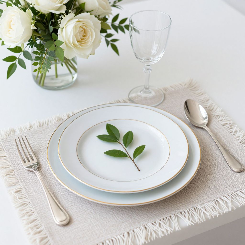 Elegant spring tablescape featuring a white plate with a gold rim, adorned with a small sprig of green leaves, flanked by silver fork and knife, set atop a textured beige placemat with fringe edges, accompanied by a clear glass wine goblet and a spoon, all complemented by a vase of delicate white roses and green foliage in the background.