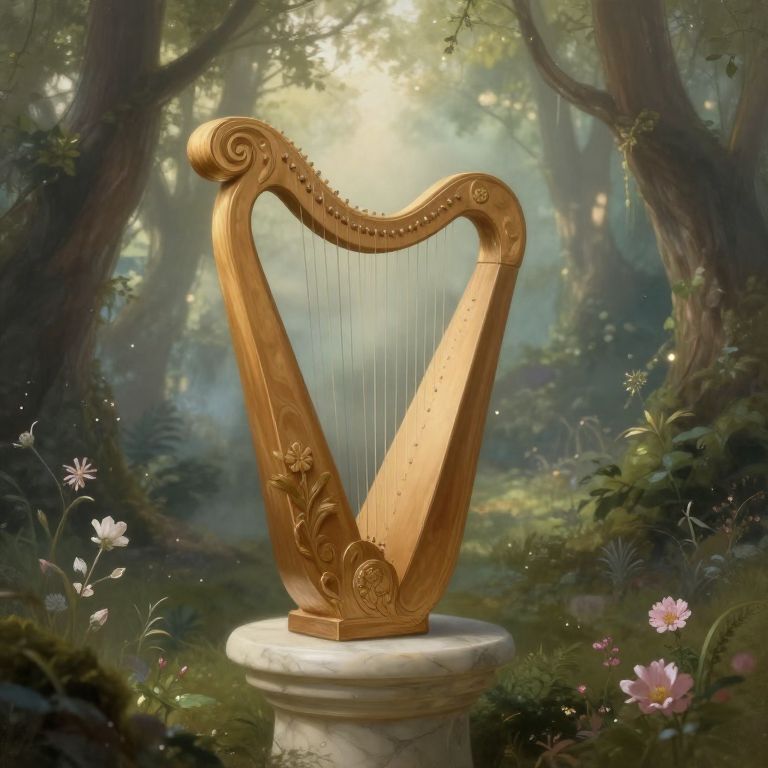 Apollo's lyre resting on a marble pedestal in a mystical forest clearing, soft glowing light filtering through the trees, enchanted atmosphere with delicate floral details and ethereal mist, highly detailed and dreamlike painting