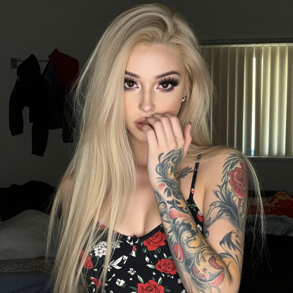 Photograph of a fair-skinned woman with long brown hair, blue eyes, and a detailed black and gray rose tattoo on her left shoulder, wearing
