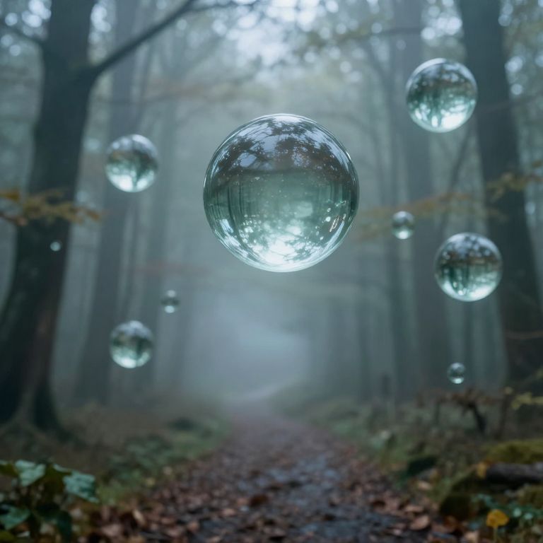 Photograph of transparent, reflective bubbles floating in a misty, dense forest with tall trees and a foggy, leaf-strewn path.