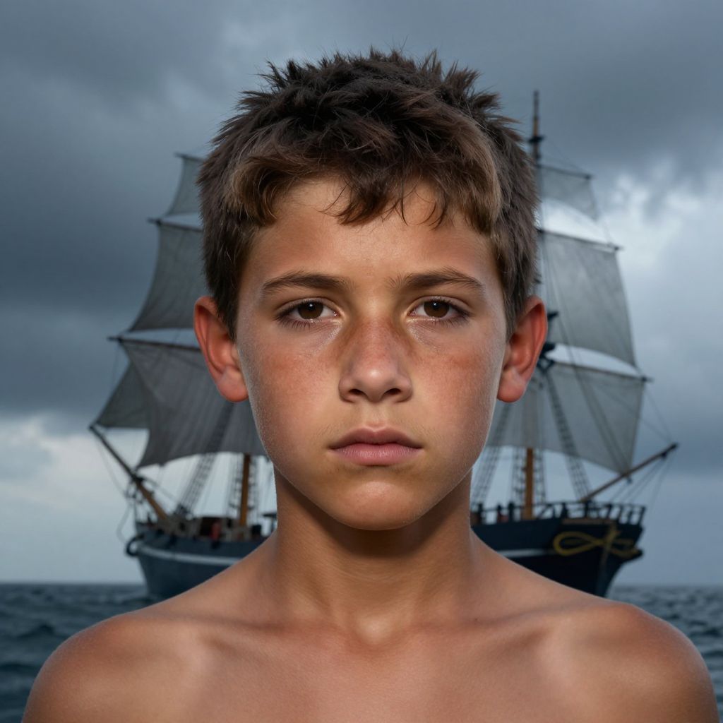 Photograph of a young, shirtless boy with short, messy brown hair and fair skin, staring directly at the camera with a neutral expression. His brown eyes are slightly sunken, and his skin is slightly freckled. Behind him, a large, old-fashioned sailing ship with billowing white sails is visible on a stormy sea under a cloudy, dark blue sky. The boy's bare shoulders and the ship's rigging are in sharp focus, creating a dramatic contrast between the boy's innocent face and the ominous maritime background. The image has a realistic, high-contrast style.