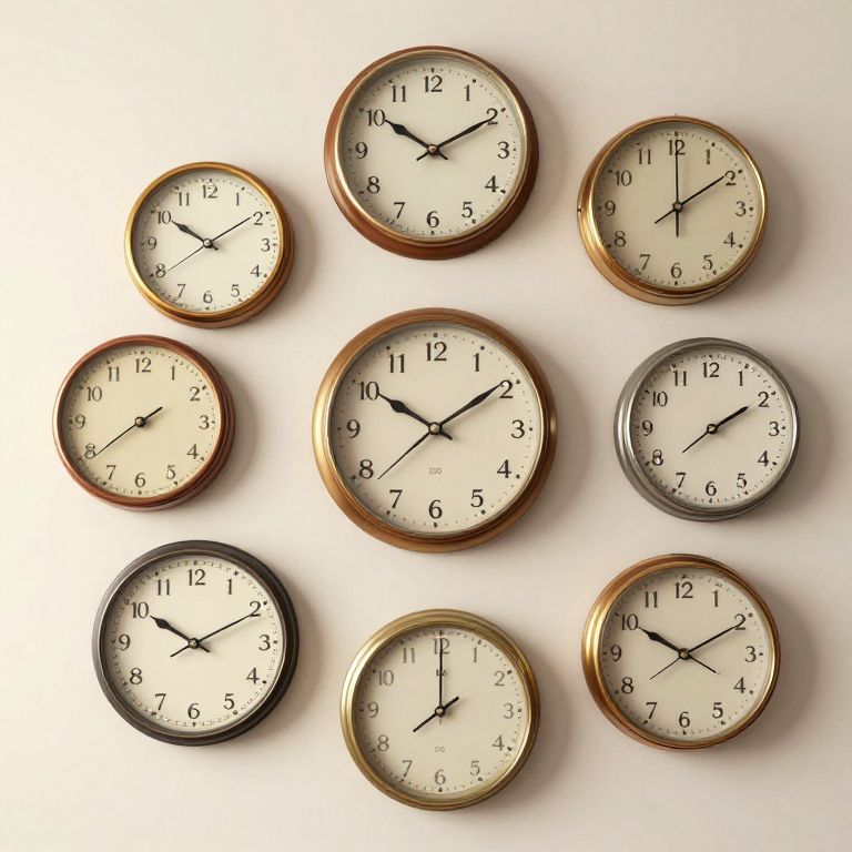 A collection of vintage-style wall clocks, each displaying different times, creates a surreal and retro-inspired arrangement on a plain wall, evoking a sense of time's fluidity and the unraveling of memories, rendered in a high-definition, computer-generated artistic style.