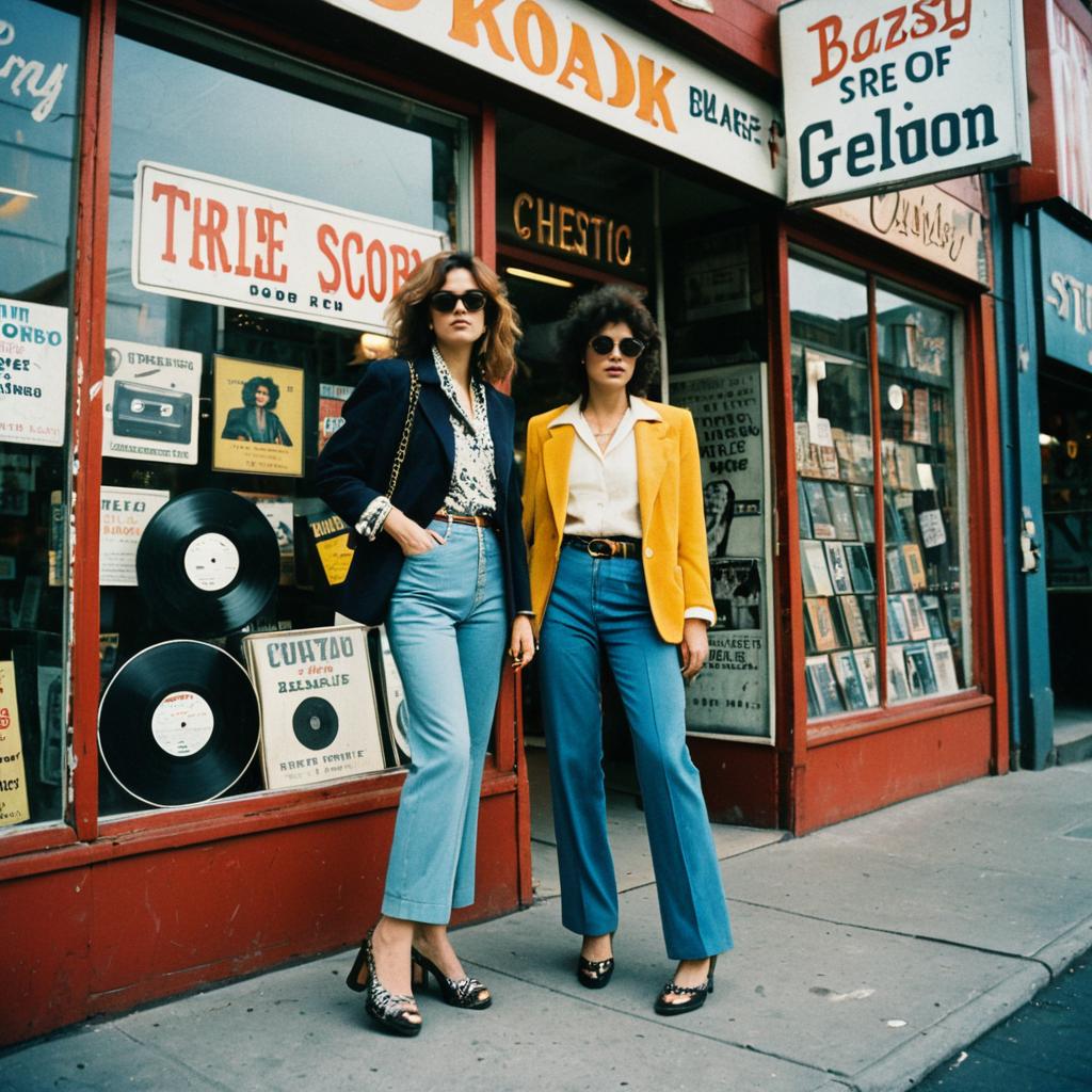 Two stylish women wearing mismatched vintage blazers and oversized sunglasses stand confidently outside a grungy record shop adorned with old records and faded tin signs. The scene captures a gritty, defiant vibe with cinematic film still quality, reminiscent of Kodak Portra film photography.