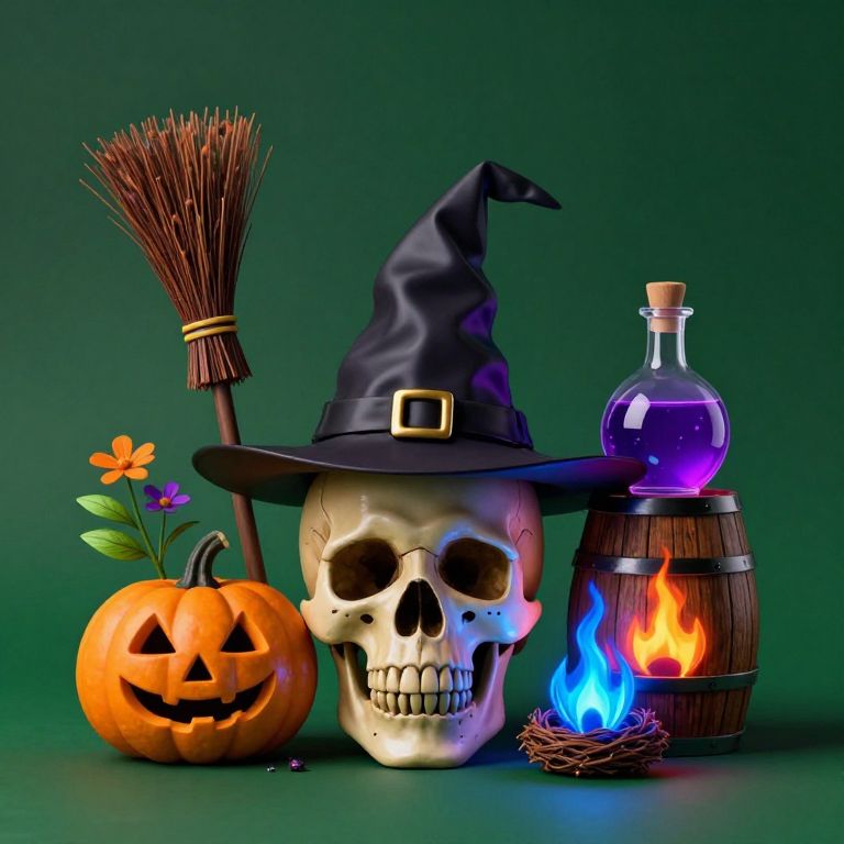 The image presents a vibrant collection of spooky witchcraft items, arranged in a visually striking manner. Central to the composition is a skull with a witch's hat, exuding a sense of mystery and enchantment. Surrounding this central figure are various objects, each contributing to the overall theme. To the left, a pumpkin with a carved face and a broomstick with a wooden handle and a triangular top add to the Halloween ambiance. A small plant with green leaves and orange flowers, along with a purple flower, introduce a touch of nature amidst the supernatural elements. On the right, a glowing purple potion bottle, a fire-filled barrel, and a glowing blue flame with a nest-like base create a dynamic contrast. The background is a deep, dark green, which enhances the visibility and impact of the colorful objects. The overall arrangement is balanced, with objects evenly distributed across the frame, creating a harmonious and engaging visual experience.