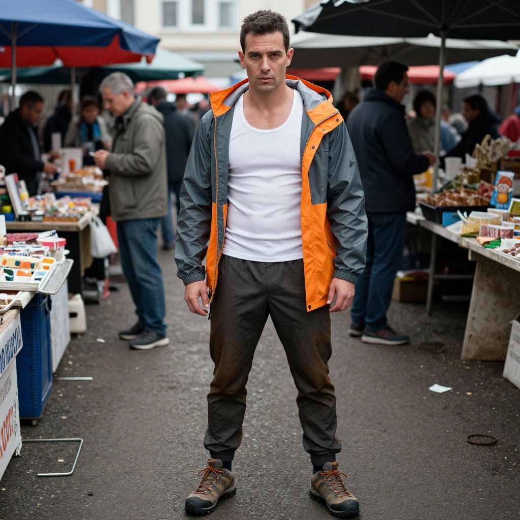 Photograph of a muscular, fair-skinned man with short, dark hair standing in the center of an outdoor market. He wears a bright orange, unzipped, hooded jacket over a tight white tank top, black pants, and brown hiking boots. The background shows blurred market stalls with various food items and people, some wearing jackets. Umbrellas and tables covered with white cloth are visible. The man's expression is serious, and the market setting has a busy, urban atmosphere with a mix of natural and artificial lighting.