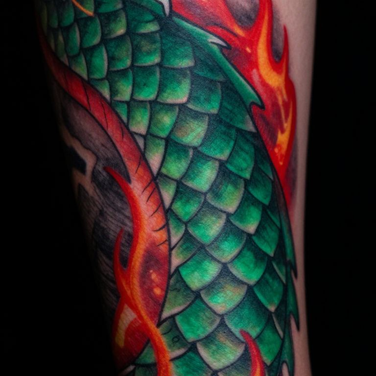 Vibrant tattoo of green, scale-like fish scales with bold red flames, detailed shading, and vivid colors on a human arm. Photorealistic