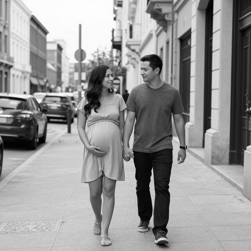 Black-and-white photograph of a pregnant woman and a man walking hand-in-hand down a narrow urban street. The woman, with long, wavy dark hair, wears a light, short-sleeved, knee-length dress and sandals, her hand gently resting on her belly. The man has short dark hair, wears a fitted gray T-shirt, dark pants, and sneakers, and looks at her with a smile. Both appear happy and relaxed. The street is lined with parked cars on the left and tall buildings on both sides, featuring dark windows and doors. The pavement is textured with small tiles. The background includes a blurred traffic sign and distant streetlights.